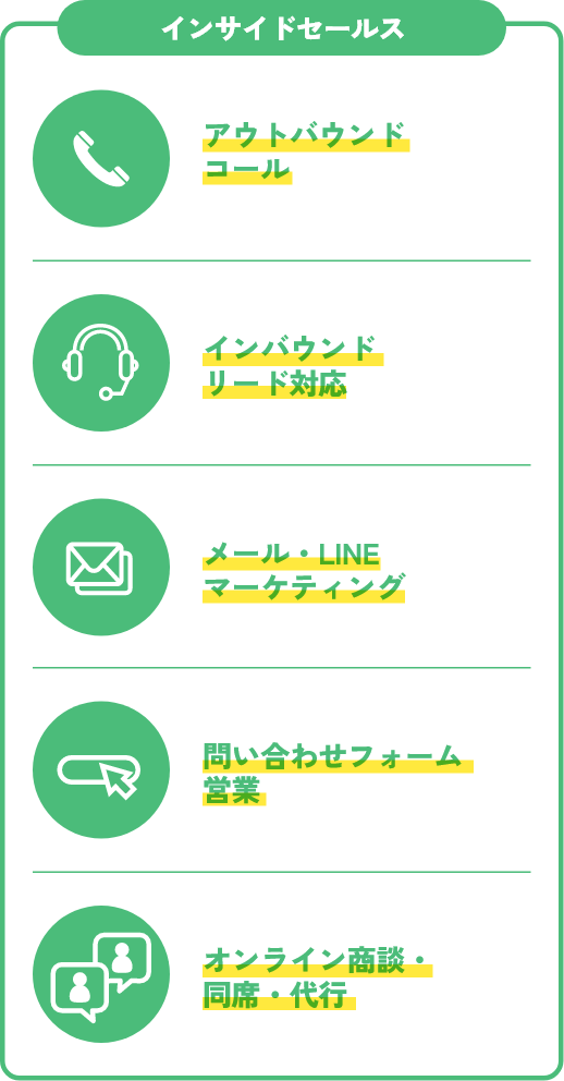 貴社営業担当として商談に同席、もしくは代行を行い、商談進行や交渉をサポート。社内教育や商談品質向上にも活用でき、経験豊富なメンバーの知見を貴社商材に反映可能です。
