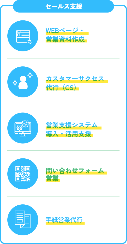 セールスに関わる全てのプロセスをワンストップで提供できるのが、私たちの強みです。戦略立案からリスト精査、アプローチ、商談、クロージング、さらには改善施策の立案まで、営業活動をトータルでサポートします。部分的な支援ではなく、全体的な最適化を意識した一貫性のある支援を行うことで、成果の最大化を実現。複雑化する営業領域を任せるパートナーとして、安心してお選びいただけます。